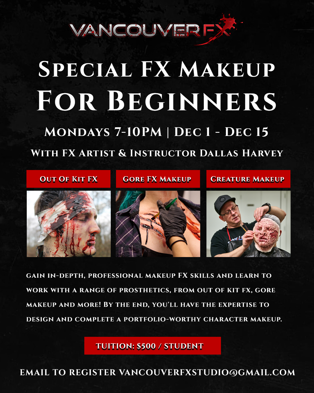 In just three intensive weekly Monday classes, you’ll go from beginner to confident creator, mastering professional Make-Up FX techniques taught by industry veteran Dallas Harvey (Professional FX Artist, Sculptor & Instructor @dallasharveyfx).