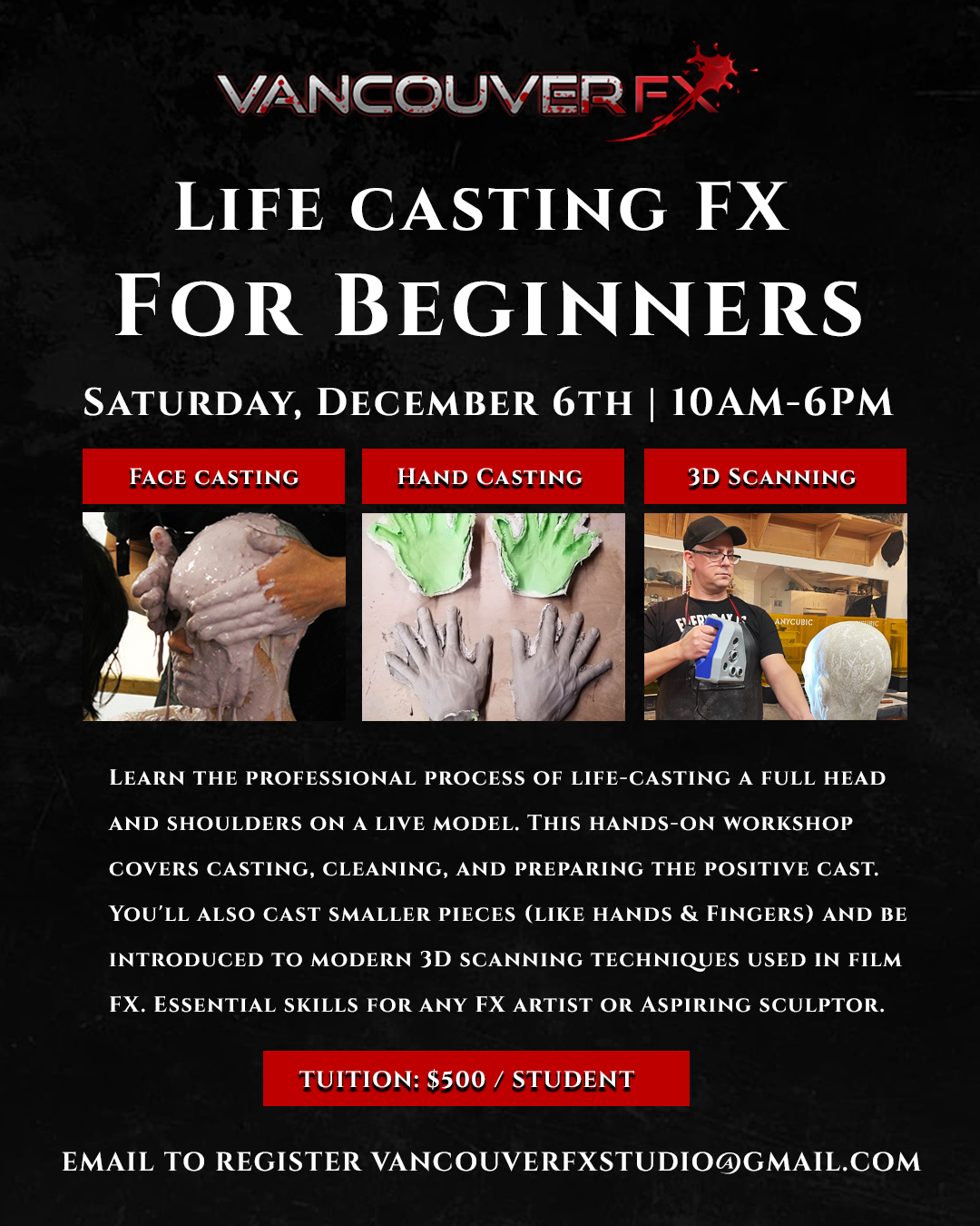 Vancouver FX is a special effects production studio and private training facility, providing a creative environment for artists of all backgrounds and styles. We offer classes and workshops on special effects makeup, prosthetic character creation, anatomy and sculpture, mold making, airbrushing, life casting, 3d modelling, and 3D printing for TV & film.