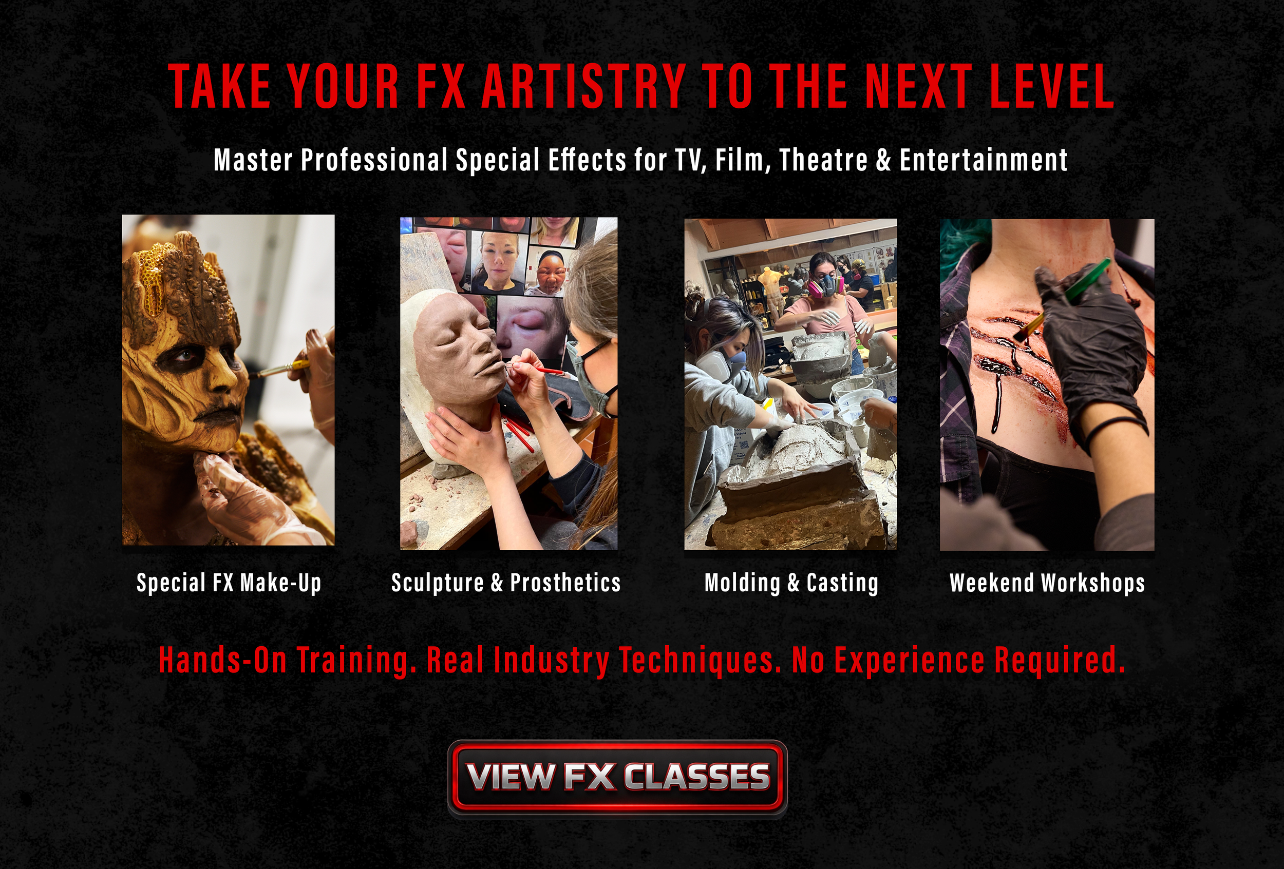 Vancouver FX offers a diverse selection of in-studio professional courses designed to teach the art and techniques of special effects makeup, prosthetic character creation, mold making, anatomical sculpting, mask design, airbrushing, and more.